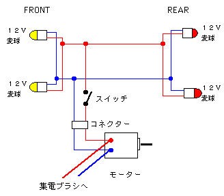 | コース電源は12Vです。どのサーキットでも実車のトラックなどの大型バッテリーで電気を供給しています。家庭用100V交流コンセントから直流12Vに換えて供給した方が簡単に思えますが、それだと電流だか電圧が安定しないらしいのです。 とにかく、自動車用バッテリーですから12Vです。(大型車は24Vですが12Vのバッテリーを2個直列にしているからです)そこで、スロットカーのライトも12Vの麦球を使います。図1の配線がそれです。図2のように4灯を3Vにして直列配線で12Vを分けたり、前後2系統で6Vの電球を使ったり、1、5Vの電球6個直列でもOKですが、レースでは前後最低1灯の確保が義務ですから、1灯切れれば全てパァの直列はお勧め出来ません。(経験者談) 又、松尾さんの経験上、ある特定の定格6Vの電球に12Vを流しても問題無いとの事ですが、異状に明るくチョットはらはらものです。12Vにしておいた方が無難でしょう。 スイッチは基本的に1系統2端子(3端子が多い)のなるべく小さなスライドスイッチが良いでしょう。走行時常時点灯で良ければスイッチは入れなくてもOKです。 モーターからの配線の間に入れるコネクターはボディとシャシーを外した時にメンテしやすく分離させる為の物です。長いコードが可動部に干渉しないよう気をつければ使わなくてもOKです。 LED(発光ダイオード)を使う場合は、最近かなり性能の良い製品が出ており、ちょっと高価ですが無色の物も在ります。しかし指向性が強く、”超高輝度”と云われる物でも正面から外れるとほとんど見えなくなってしまいます。テールランプに使うにはLED本来の赤色の物は優れています。定格入力は通常2〜3Vで超高輝度タイプには4V位の物も在りますが、抵抗を入れて2〜3Vに落とさなければ使えません。12Vからですから9〜10V落とすわけです。約50Ωで1V落ちますから450〜500Ωの抵抗を使います。きっちりと100、150、200Ω・・・と云う抵抗は無いので半端な470Ωあたりで良いでしょう。 解説:竹脇隆 |