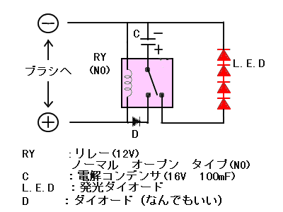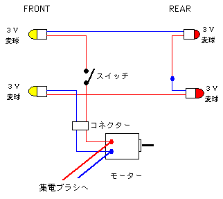 | 今度はストップランプをブラシの電源を利用して点けようというものです。いまはなき新宿アリゾナサーキットなどで限定製品として販売されていたりしましたが、下の配線図どうりに組み立てれば誰でもストップランプを点灯させることができます。 コントローラーを放すとブレーキかかり、ストップランプ用の発光ダイオードが点灯してあたかもブレーキランプのようになり、またコントローラーを握るとストップランプが消えて加速します。ボタン電池などを車に積んで水銀スイッチなどで点灯させるというような方法もありますが、ブラシ供給の電源ですので、一度組んでしまえば途中でバッテリー交換の必要もないし、マニアックなもので人に自慢できると思います。 |